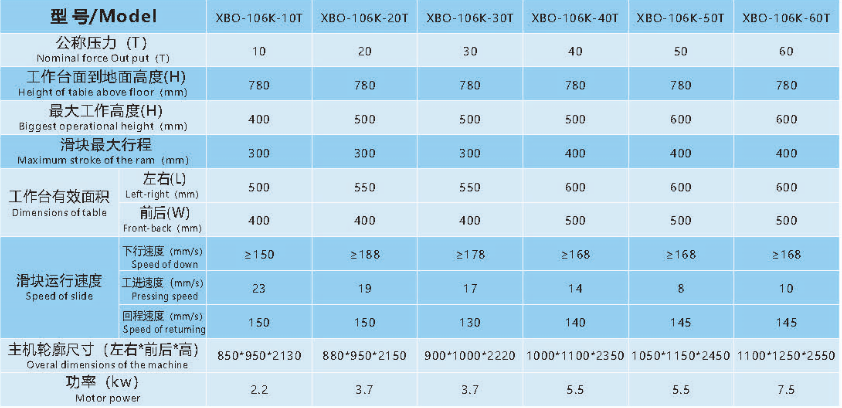 xbo-106k壓鑄件切邊機用途:各類鋁、鎂合金壓鑄制品的毛邊沖切,塑料制品的整切;也適用于塑性材料的成型如板料的落料、拉伸、壓印等以及塑料、粉末制品的壓制等多種用途。汽車和摩托車配件行業用途最廣泛。特點:▼采用四柱三板式結構,活動板與工作面平行精度好,四個精密導套使下壓垂直好;▼安全設計周全,雙手操作,設有緊急按鈕(光電保護裝置需另加裝)及上下寸動調模按鈕;▼工作臺面配有落料槽及吹氣裝置,提高生產效率;▼壓力、行程、速度、保壓時間、閉合高度均可按需求調整,方便操作。